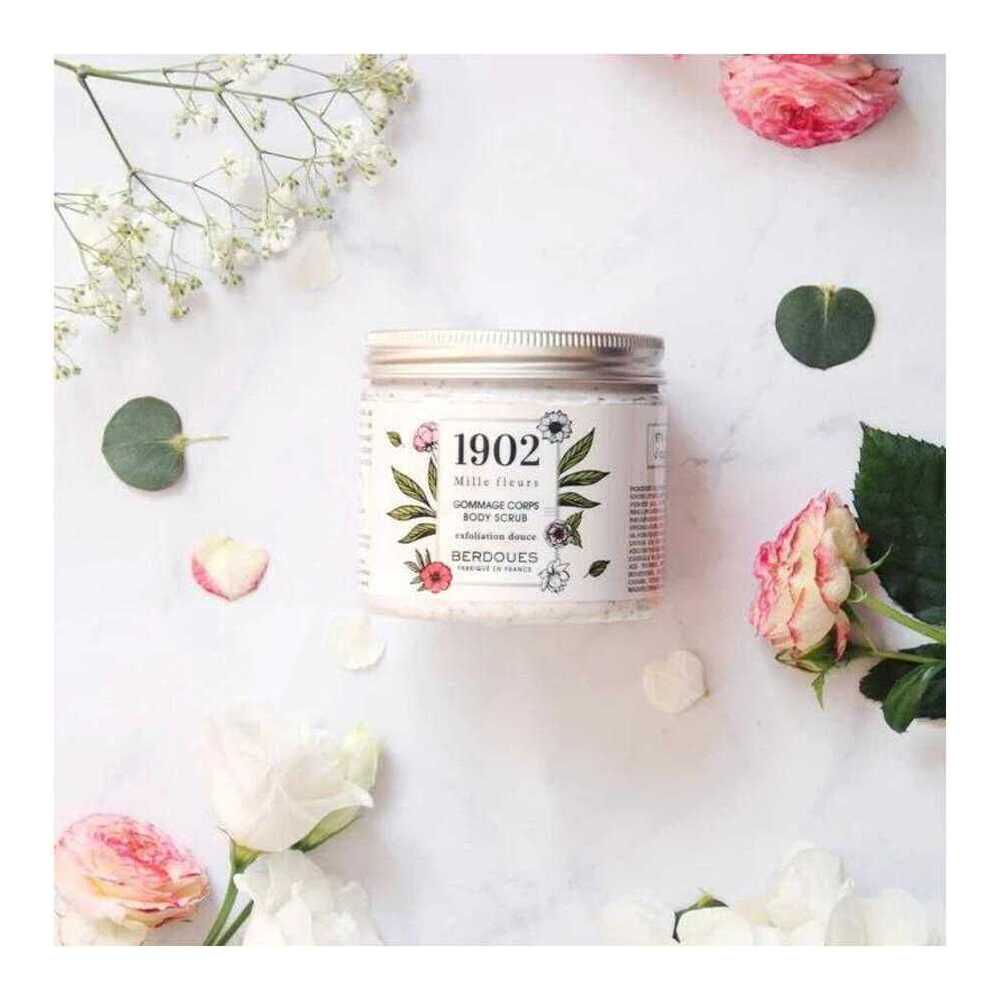 Enriched with camellia oil complex, lime tree infusion, pot marigold extract, shea butter, and peach kernel with exfoliating properties, this body scrub with a non-drying texture gently eliminates dead cells and delicately perfumes the skin.