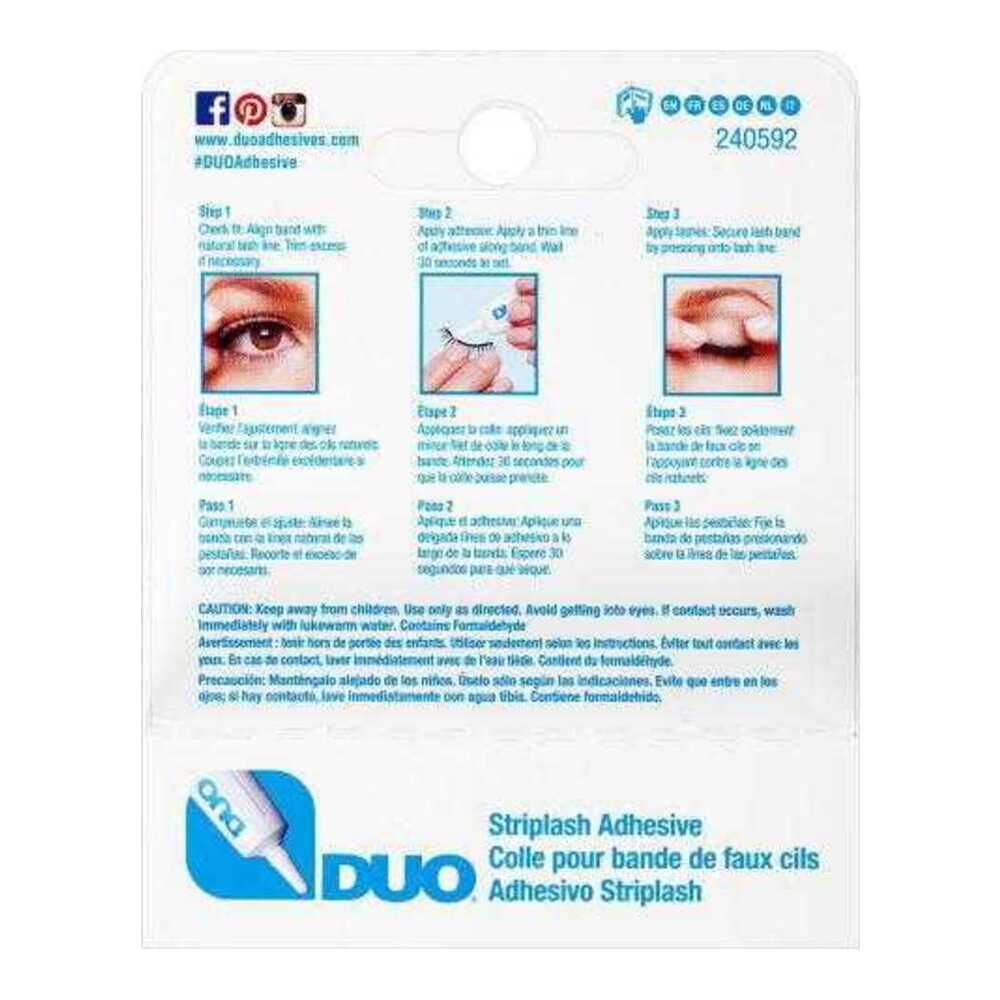 DUO Striplash Adhesive is a latex-based eyelash adhesive that was created for all-day wear with strip lashes and can also be used to apply individual lashes. DUO Striplash Adhesive dries clear after application.